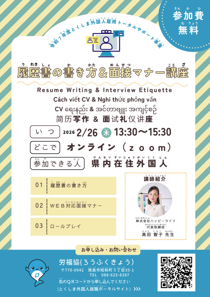 定住者、留学生、JETプログラム参加者、技術・人文知識・国際業務、特定技能1号および2号、家族滞在、特定活動等の在留資格者等、県内外在住外国人求職者